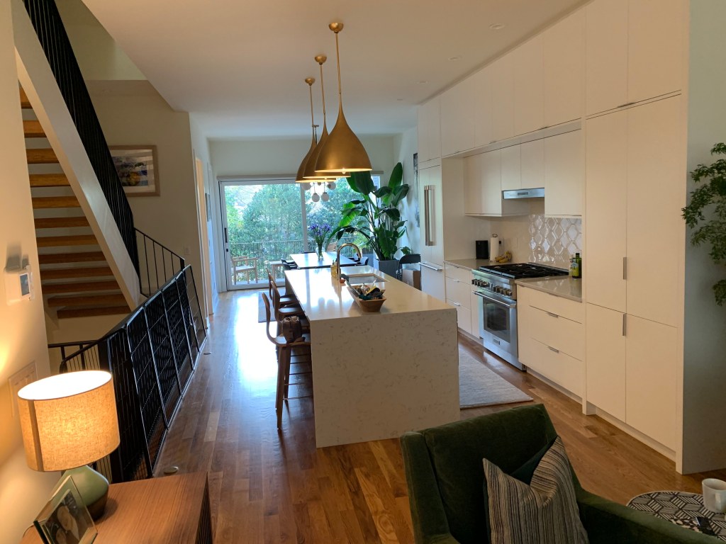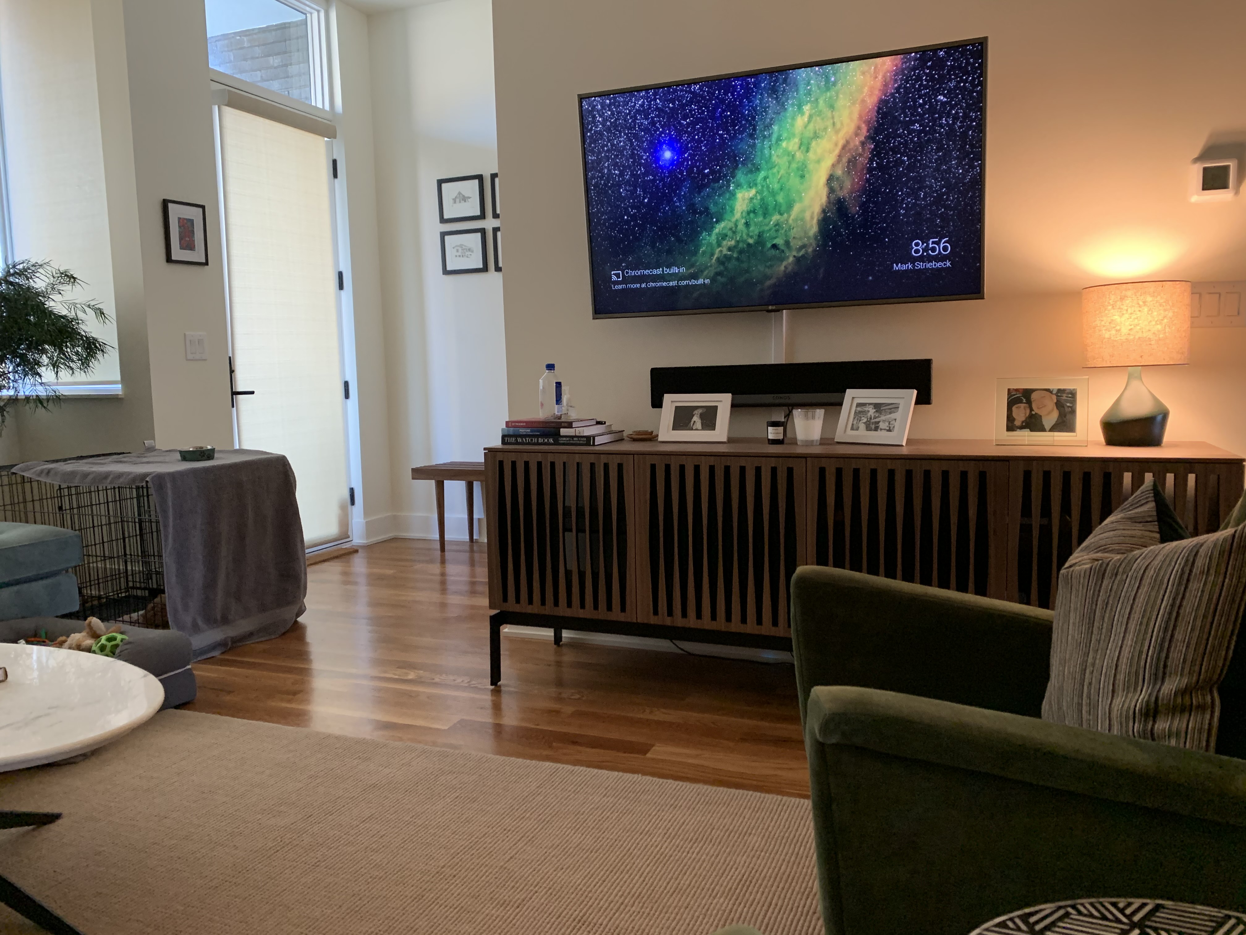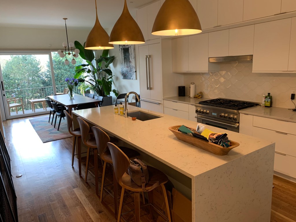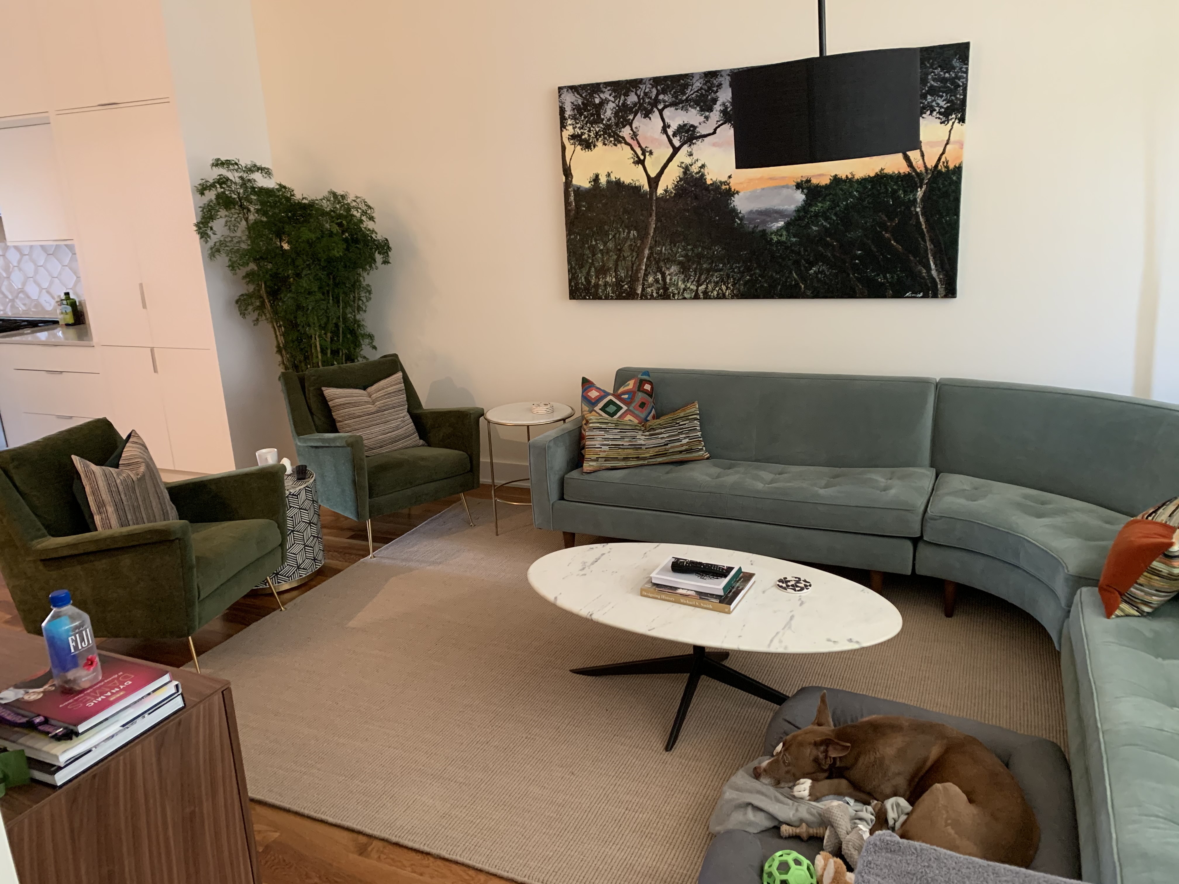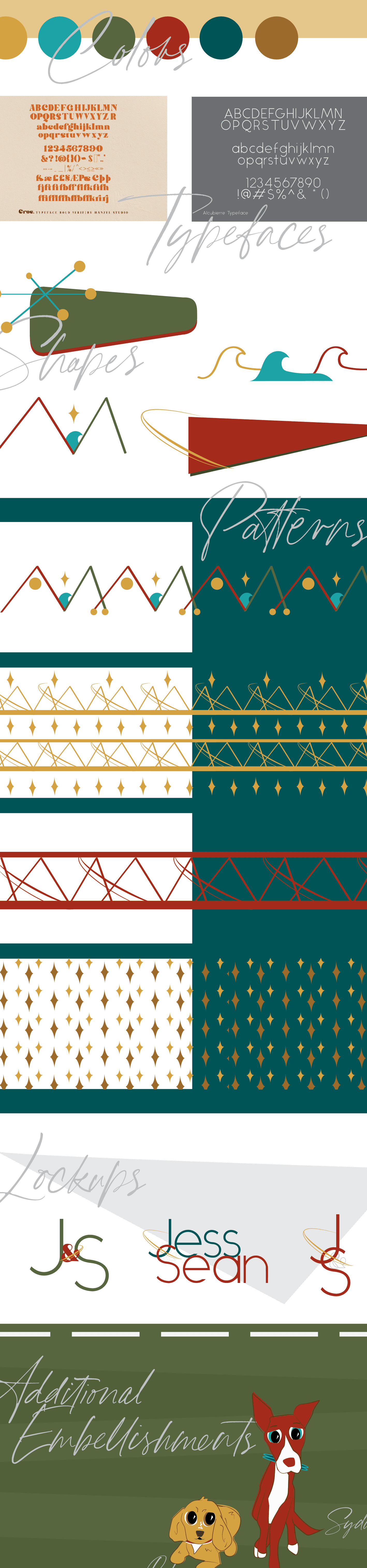 I discovered through J+S’s answers (and an interview/tour of their home/meet and greet of their pups) that they valued clean minimalism but also wanted something kitchy, colorful and fun. We landed on mimicking artwork in the direction of a Hanna-Barbera experience, highlighting mid-century modern through the lens of the eyes of someone like Rolee, their double-doodle pup.