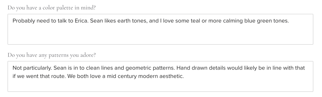 I get to know couples by asking questions that help identify unique parts of them. They may not have a pattern they know they love, but by asking about their personal style or where they gravitate, I get a clearer picture of their *vibe*.