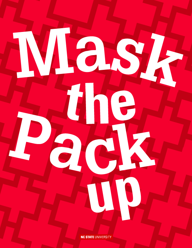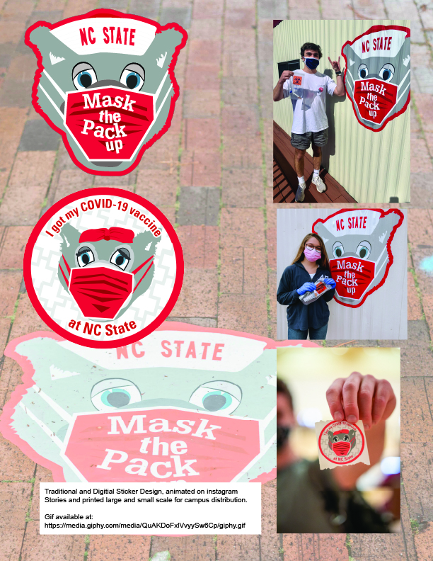 During an incredibly difficult time in the world, our institution found itself pivoting to accommodate safety and community on our campus. Essential workers championed campus providing health, housing, and facility maintenance to accommodate faculty, staff and students on campus. The Mask the Pack up campaign was created to usher in the community expectation of face coverings at all times on campus to slow the spread of Covid-19. A lighthearted nature was important when the rest of the world was darkened with immense struggle. Using the University mascots, Mr. and Ms. Wuf, we encouraged the NC State community to band together while remaining socially distant. The Pack takes care of each other—and we set out to watch each other’s backs. The campaign began as “Mask up or Pack up” and evolved into “Mask The Pack Up” that was shared with the entire NC State community through print and digital platforms. Campus screens, printed stickers, digital and printed posters/flyers and large format prints were displayed across campus. Once the vaccine became available to our Student Health provider, we retained the artwork for our official “I got vaccinated” sticker.